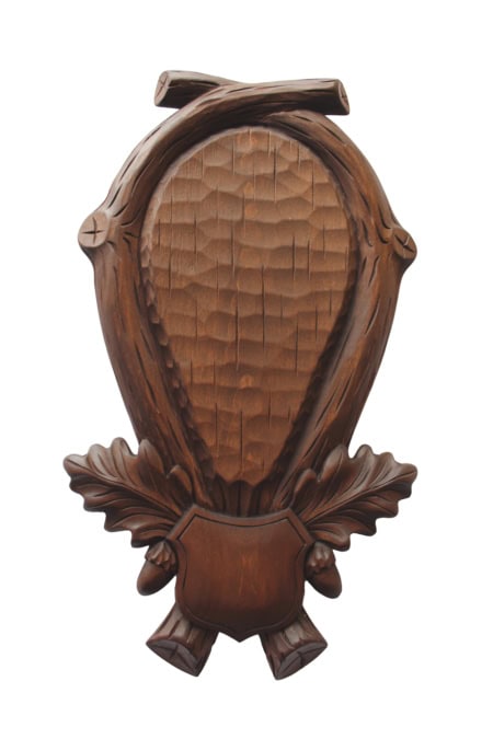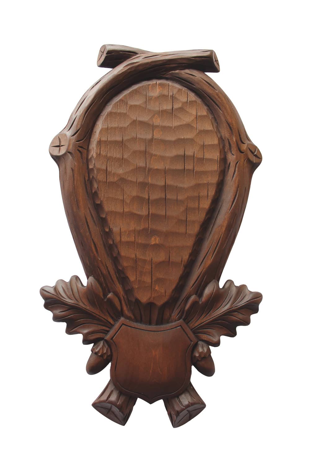 Podložka pod trofej – navržená a ručně vyřezaná z lipového dřeva, mořená vždy do jednotného odstínu (tmavá hněď) a navoskovaná anglickým voskem.